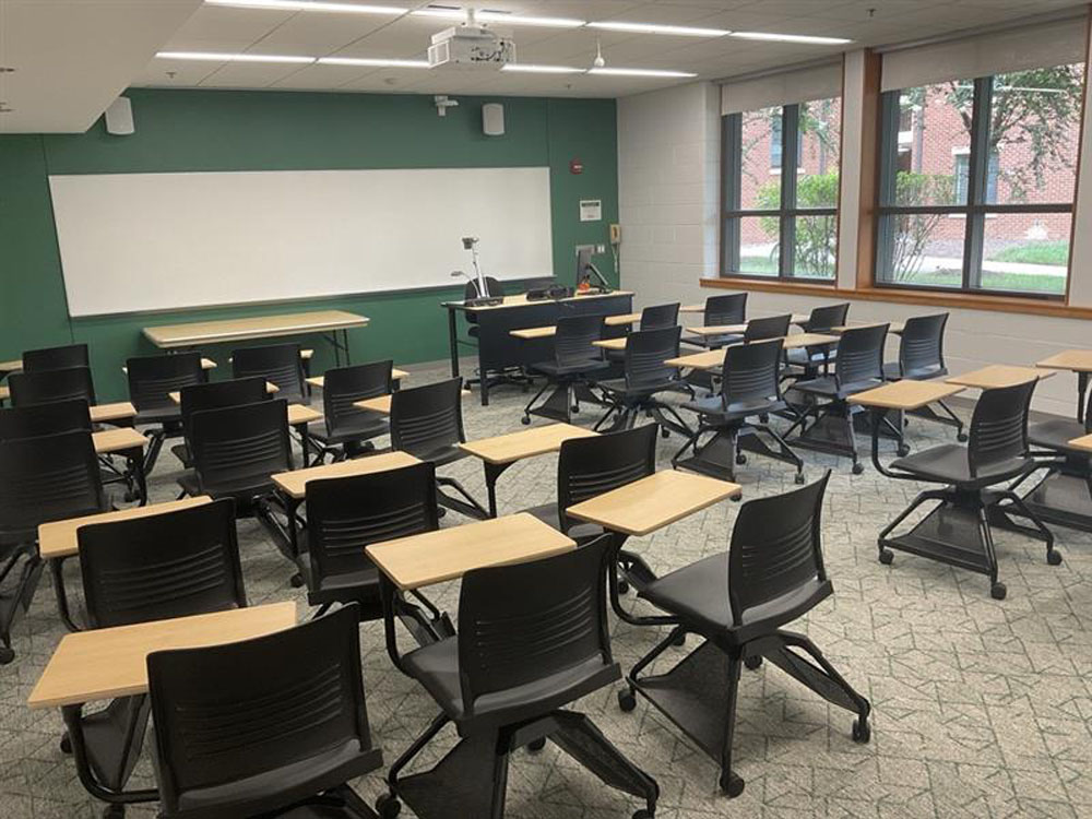 These photos give a specific room view. For precise room capacity and photos showing the furniture and layout of your exact classroom, please log in to 25Live.