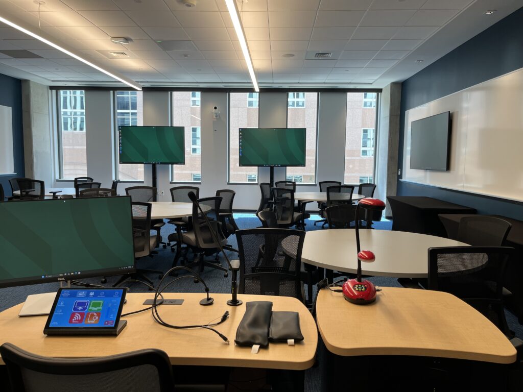 These photos give a specific room view.  Click to enlarge photos.  For precise room capacity and photos showing the furniture and layout of your exact classroom, please log in to 25Live.