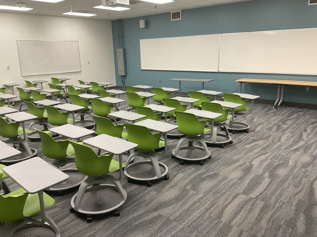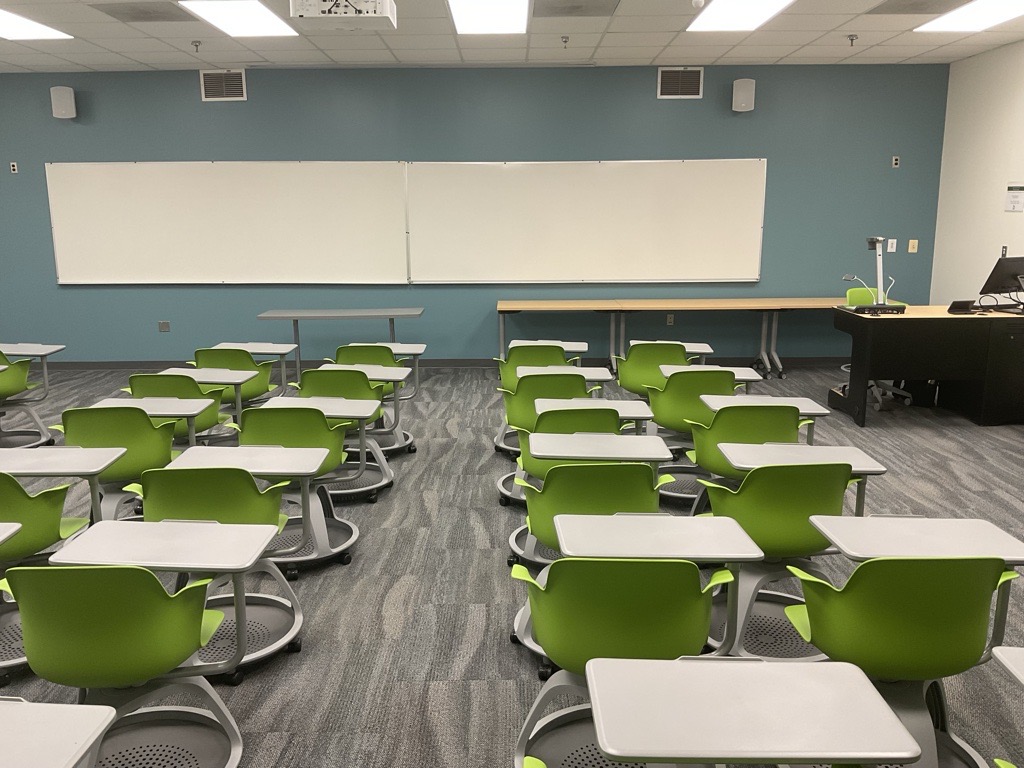 These photos give a typical room view. For precise room capacity and photos showing the furniture and layout of your exact classroom, please log in to 25Live.