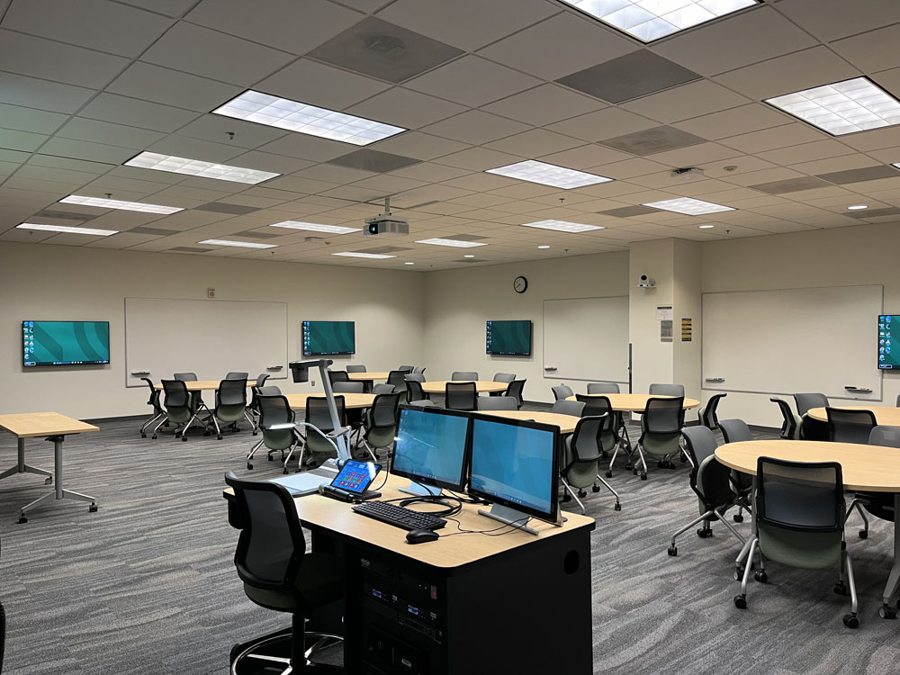 These photos give a specific room view. For precise room capacity and photos showing the furniture and layout of your exact classroom, please log in to 25Live.