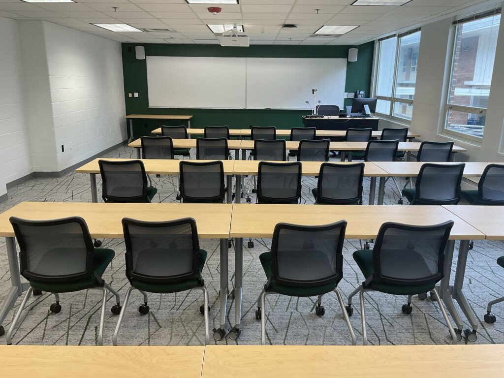These photos give a typical room view. For precise room capacity and photos showing the furniture and layout of your exact classroom, please log in to 25Live.